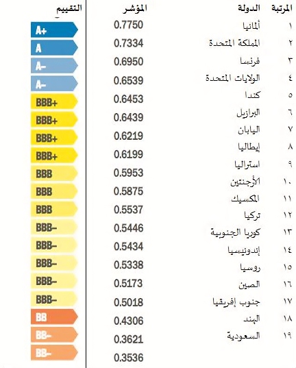 من أجل إيراد “الجدول الدوري” لمجموعة العشرين المدرج في هذا التقرير، احتسب متوسط التصنيف البيئي لكل بلد، من 12 مؤشر بيئي، ويتم تحديد مرتبة الدولة بالمقارنة مع نظيراتها في مجموعة العشرين G20.